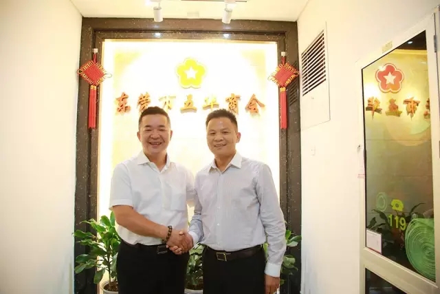 广东省客家商会会长温纯青(右)与东莞市梅州商会会长蔡鸿章(左)合影