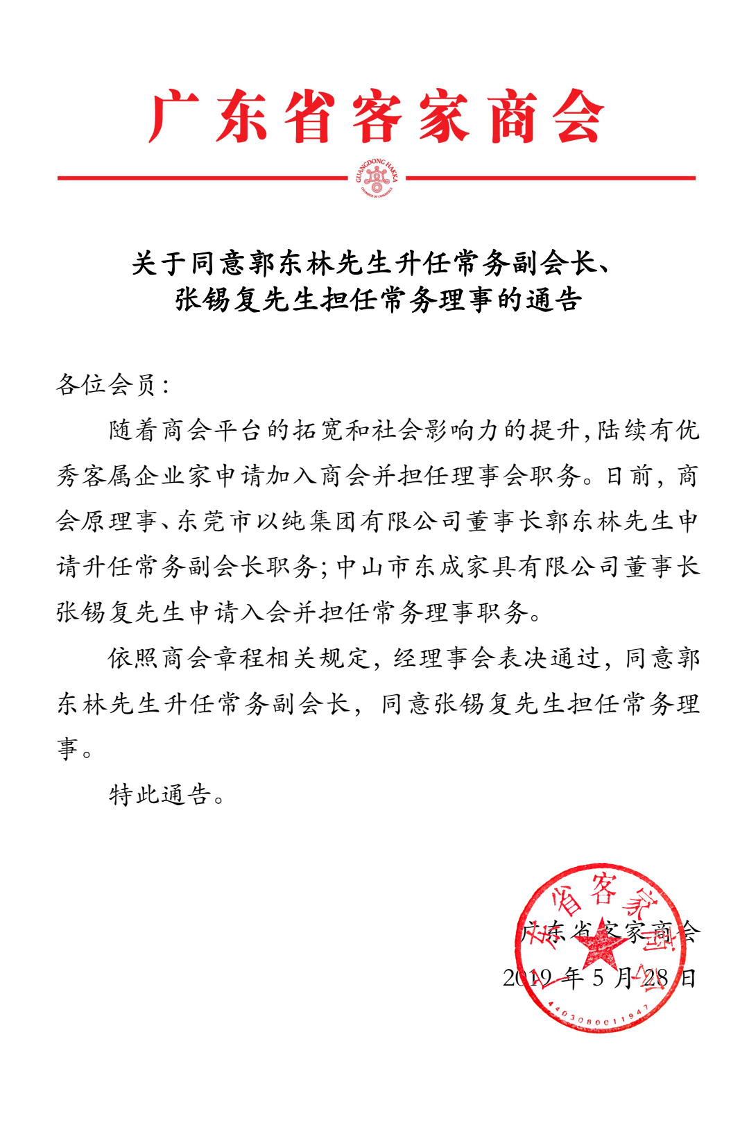 关于同意郭东林先生升任常务副会长、 张锡复先生担任常务理事的通告