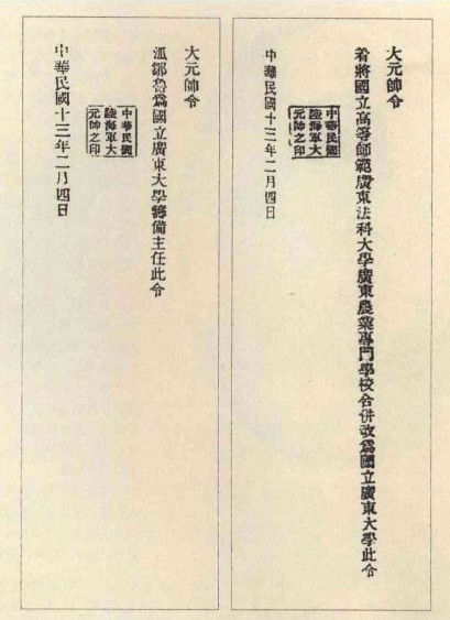 1923年冬,孙中山为北伐革命计,决定在广州创办“文武两学堂”,文学堂即广东大学,武学堂即黄埔军校(陆军军官学校),广东大学由邹鲁主持,黄埔军校由蒋介石主持。邹鲁回忆:“十二年冬,有一天,总理召我往见。坐定后,总理就说:‘你办高等师范数月,成绩很好,现在广东教育,还没有完整的计划,我想把国立高等师范、广东法政大学和广东农业专门学校等三校,合并起来,组成国立广东大学,你可即去筹备。’总理立刻就委我任筹备主任,负责进行。同时还提到广东工业学校和广州第一中学,亦由我去指导,使广东整个高等教育能在党的指导之下,免人渗入。”