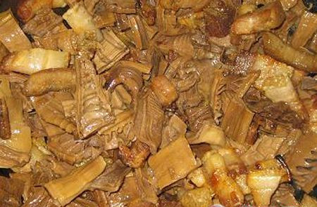 原料:竹笋干50克、三层肉150克、腐竹50克、干墨鱼20克、盐3克、鱼露2克、味精3克、酱油2克、白糖2克、胡椒0.5克、蒜茸适量。 制法:干竹笋、墨鱼用温水浸泡软,分别斜刀片成薄片,三层肉切处,腐竹用清水浸泡软切成段,起镬,三层肉拌入酱油放入镬中略煸炒香,随即放入蒜茸,爆香后下竹笋、黑鱼翻炒后,加入汤水,调入味料,转入沙煲,用中火焖约20分钟后再落腐竹继续焖煮。待汤水收紧时调入湿粉成茨,加入尾油便成。